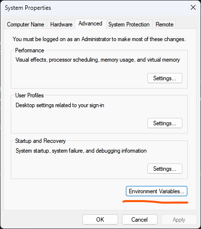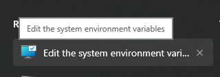 - В поске виндовс наберите environment variables и нажмите Edit the system environment variables. в русской версии виндовс это будет Переменные окружения и Изменить системные переменные окружения.